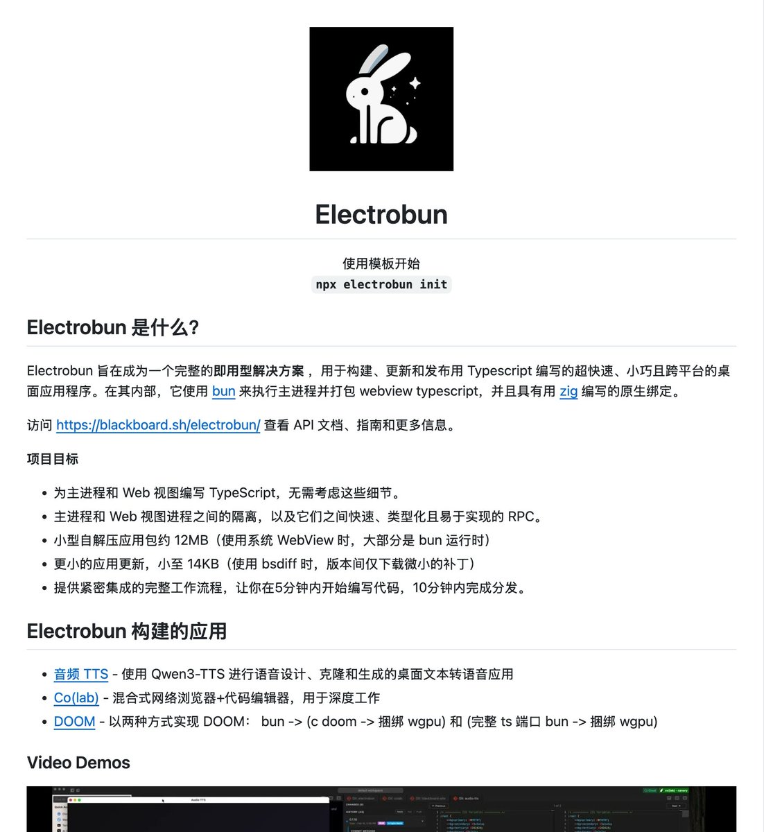 Electrobun:主进程用 bun 跑 TypeScript,UI 用系统自带 WebView(macOS WebKit、Linux WebKitGTK 等),原生层通过 Zig/C++ 实现绑定。