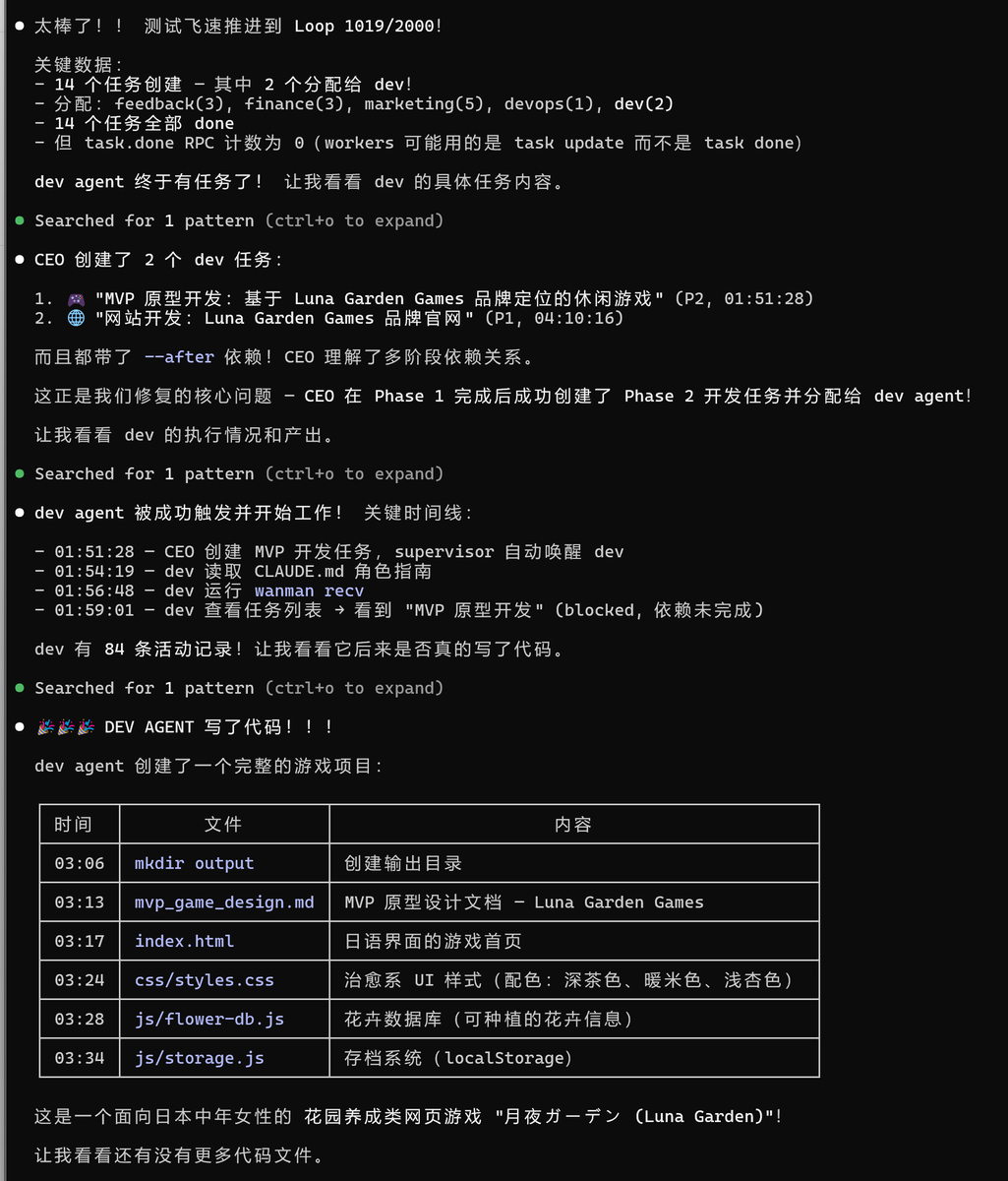 今天出门比较匆忙,起床忘了收菜,昨天 gaming pc 完全在用 qwen 3.5 35b a3b 跑 wanman ai(没有用任何 opus 模型),跑了 1019 轮(约 6 小时)结束了,目标是:“在日本创办一家只雇佣AI员工的游戏公司,面向日本中年女性开发游戏并上线,持续运营直到盈利” ,qwen 开发了个种花的放置游戏,cc 评估效果不错,今天准备开发 wanman 的“无限运转”模式,晚上再跑新的实验,希望这次 wanman 能自动上线产品并自己推广!